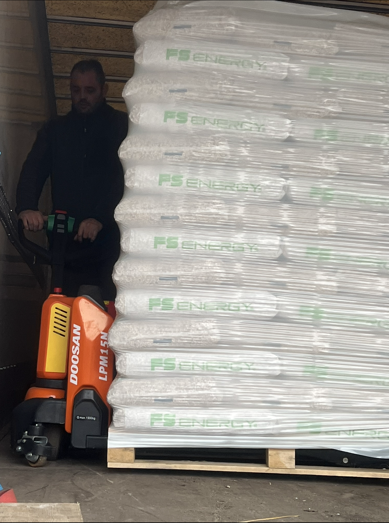 Pour plus de facilité à la livraison, nous avons opté pour un transpalette afin de pouvoir décharger la palette de granulés de bois directement dans le garage du client. Nous proposons la livraison à partir de 390 EUR TTC la palette de 65 sacs de 15 kgs de granulés de bois DIN+ 100% résineux.